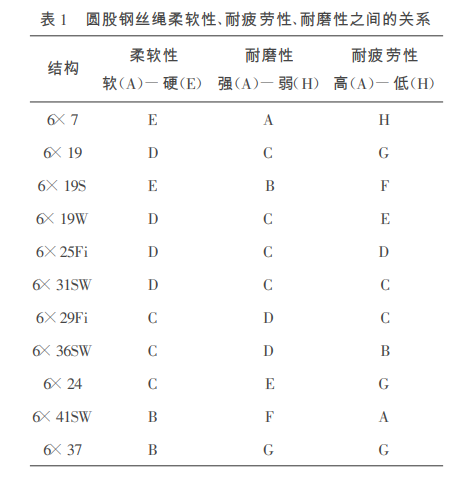 (3)最后選擇時還需綜合考慮鋼絲繩的柔軟性、耐疲勞性、耐磨性、耐擠壓性以及價格等因素,一般常用圓股鋼絲繩柔軟性、耐疲勞性、耐磨性三者之間的關(guān)系見表1.耐擠壓性一般來說股內(nèi)鋼絲數(shù)少相對穩(wěn)定";