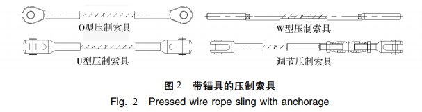 壓制鋼套索具根據(jù)結(jié)構(gòu)類別,大體可分為0型、U型、W型及調(diào)節(jié)索具,帶錨具的壓制索具如圖2所示。如果沒有特殊要求,索具表面一般鍍鋅處理,鋅層厚度為15~30um0,鍍鋅后脫氫處理。0型壓制索具耳板部位一般不帶銷軸;U型壓制索具耳板部位帶有銷軸、端蓋和開槽沉頭螺釘。如果客戶有要求,銷軸也可以制作成帶螺母和開口銷形式。接頭的尺寸可根據(jù)客戶的使用要求而定;W型壓制索具即為外螺紋壓制索具,根據(jù)實(shí)際需要螺紋桿上可配備相同規(guī)格的螺母和墊圈;調(diào)節(jié)索具都帶有調(diào)節(jié)裝置,用來調(diào)節(jié)索具的長(zhǎng)短。調(diào)節(jié)裝置兩端的螺母達(dá)到緊鎖防松作用。如果鋼絲繩的規(guī)格和結(jié)構(gòu)相同,幾種形式的索具根據(jù)計(jì)算公式得出的壓制比也相等。如果索具兩端都帶錨具,兩端錨具的形式根據(jù)客戶需要可任意組合。調(diào)節(jié)索具通常一端調(diào)節(jié),另一端固定,根據(jù)現(xiàn)場(chǎng)使用情況,也可制作成兩端調(diào)節(jié)即雙調(diào)節(jié)的壓制索具(圖2)。