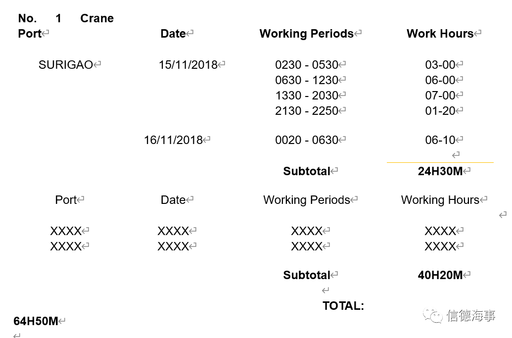 1.當使用克令吊進行裝卸貨作業(yè)時,大副應安排值班駕駛員對所有克令吊的實際作業(yè)時間進行記錄,離開港口后進行統(tǒng)計(記錄示例如下),并克令吊鋼絲繩的經(jīng)驗使用壽命比對,以預估克令吊鋼絲繩是否可以完成下一個港口的張卸貨任務;如果不能,則應把相關情況向管理公司報告并申請換新鋼絲繩。