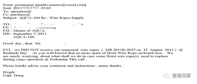 2011年,本人曾經(jīng)在一條靈便船工作,6月初在巴拿馬上船跟船一直到6月29日在福建的羅源港接管船舶。在跟船期間,經(jīng)仔細檢查后發(fā)現(xiàn)克令吊鋼絲繩狀況不佳且僅僅有一套備用庫存,因而接管后立即安排大副向公司申請在新加坡供應3套鋼絲繩,后公司因費用等問題沒有安排。船上隨后持續(xù)申請在新加坡后的各個港口供應鋼絲繩,但均沒有供應上船。后船舶在南非裝糧到墨西哥的VERACRUZ港卸貨,結果因三個克令吊的吊貨鋼絲繩先后達到磨損極限而不得不停工而導致了時間及費用上的損失。