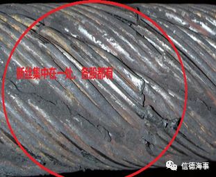 鋼絲繩的斷絲原因很多,包括拉力斷絲/切斷斷絲/疲勞斷絲/壓倒及壓扁斷絲/外傷斷絲/磨損斷絲/腐蝕斷絲/火花斷絲等。一般情況下,疲勞是引起鋼絲繩損壞的主要原因,因此斷絲是在使用一段時間以后才開始出現(xiàn);但斷絲數(shù)會逐漸增加且時間間隔越來越短。在此情況下,十分重要的是大副及水手長需要及時監(jiān)控并仔細(xì)檢驗記錄鋼絲繩工作時間及斷絲情況,并根據(jù)這個記錄總結(jié)出斷絲時間長短的規(guī)律以用來后期確定鋼絲繩更換的大概時間。