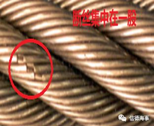 4.集中斷絲:在一個繩股上有超過外股的鋼絲總數(shù)的5%,或者集中斷絲在一個地方上有超過外股的鋼絲總數(shù)的5% (一般韓國產(chǎn)的鋼絲繩有類似說明)