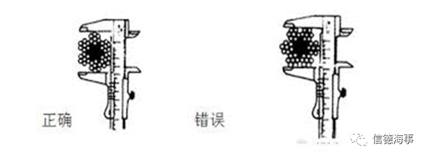 6.當(dāng)鋼絲直徑磨損并減少了鋼絲原來公稱直徑的7%(日本勞工安全規(guī)則一般如此規(guī)定). 但無論如何,貨物克令吊船舶的大副,需要認(rèn)真查核克令吊及鋼絲的說明書,并且遵守其規(guī)定(如果該說明書中的要求的標(biāo)準(zhǔn)更高的話)。當(dāng)然,大副在測量鋼絲繩直徑時,必須方法正確,并必須勤測量鋼絲繩易磨損的經(jīng)常運動的部分。