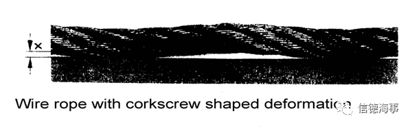 1)Wire rope with corkscrew shaped deformation 螺旋型變形(有的叫波浪型變形)。出現(xiàn)波浪形變形時,在不超過25倍鋼絲繩公稱直徑的長度范圍內(nèi),若X≥ d/3,則鋼絲繩應(yīng)報廢。式中d為鋼絲繩的公稱直徑。