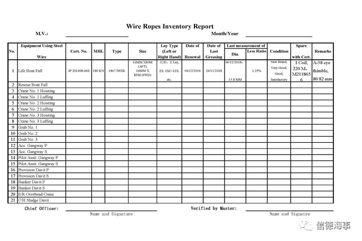 該表格中“REMARKS”一欄可以填寫嵌環(huán),更換地點,備件供應(yīng)港口,鋼絲繩外部磨損/銹蝕/結(jié)構(gòu)松散/形狀改變/鋼絲擠壓等信息