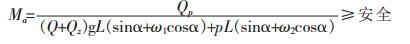 式中:Qp為鋼絲繩所有鋼絲破斷力之和,/N;Q為一次提升載荷,/N;Qz為容器自身重力,/N;P為提升鋼絲繩每米重量,/(kg· m-1);L為鋼絲繩最大長(zhǎng)度,/m;α為井筒傾角,/(°);ω1為容器運(yùn)行系數(shù),0.01~ 0.015;ω2為鋼絲繩運(yùn)行時(shí)與托輥和底板的阻力系數(shù).