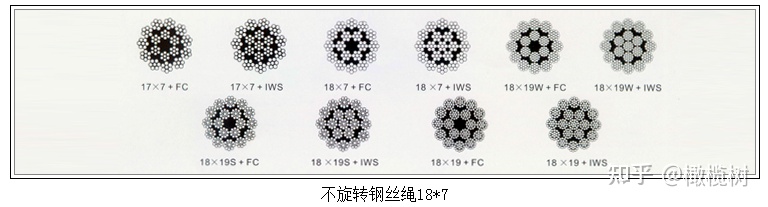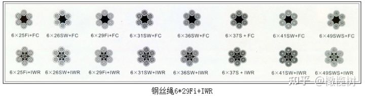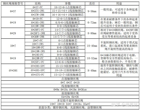 鋼絲繩規(guī)格按照結(jié)構(gòu)分類有:6*37+FC,6*37+IWS,6*37+IWR,6*19+FC,6*19+IWS,6*19+IWR,6*19S,6*19W,6*29Fi,6*25Fi,6*26SW,6*31S,6*36SW,6*37S,18*7,18*19,17*7,8*19,35W*7等等。前面的數(shù)字代表鋼絲繩的規(guī)格是有多少股組成的,后面的數(shù)字代表鋼絲繩的每一股含有多少條鋼絲。例如6*37的意思就是鋼絲繩規(guī)格一共有6股,每一股有37根鋼絲。6*7 6*19 6*37一般為點(diǎn)接觸鋼絲繩,6*9w 6*19s 6*19w 6x36sw一般為線接觸鋼絲繩,6k*19w 6k*36一般為面接觸鋼絲繩,18*7 18*19 35*7 18*19s 35w*7一般為多層股不旋轉(zhuǎn)線接觸,18*7k 35w*7k一般為多層股不旋轉(zhuǎn)面接觸。